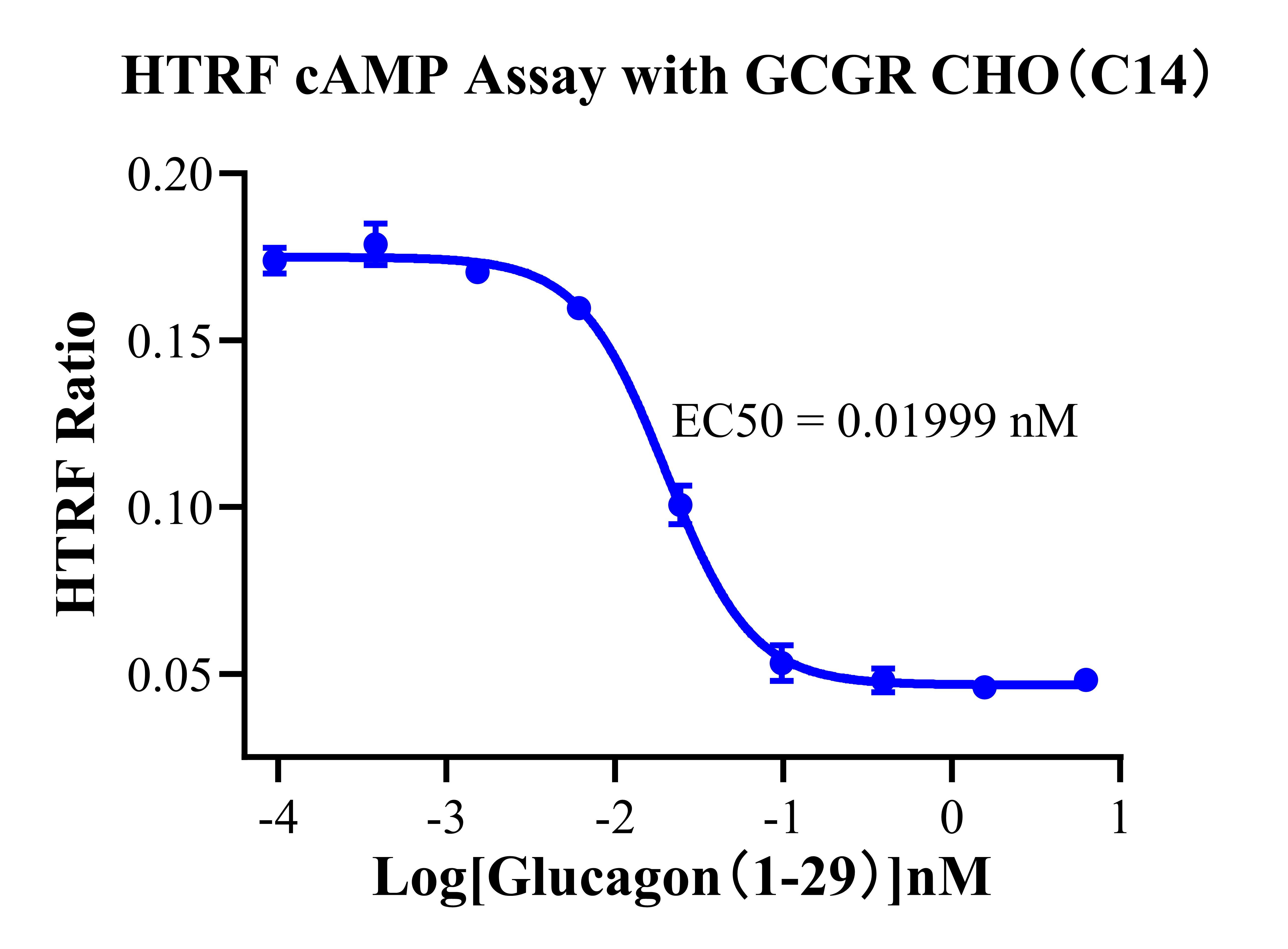 cAMP 在 G 蛋白偶聯(lián)受體(GPCR)信號(hào)轉(zhuǎn)導(dǎo)中是一種關(guān)鍵的第二信使。當(dāng)配體結(jié)合到 GPCR,構(gòu)象發(fā)生變化,激活受體接著激活 G 蛋白,Gs 的激活導(dǎo)致腺苷酸環(huán)化酶調(diào)控 cAMP 的升高。GCGR CHO 藥靶模型很好的模擬了體內(nèi) GCGR 的信號(hào)轉(zhuǎn)導(dǎo)過程,原理見下圖所示。![]() Figure 1. GCGR CHO 細(xì)胞模型原理圖 |