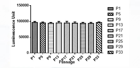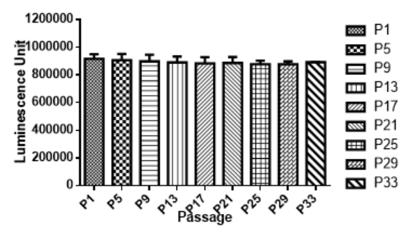 4. 示蹤細(xì)胞體外發(fā)光測(cè)試,測(cè)定發(fā)光信號(hào)強(qiáng)度和細(xì)胞傳代信號(hào)穩(wěn)定性,確保示蹤細(xì)胞在體外和體內(nèi)都能穩(wěn)定高水平表達(dá)標(biāo)記蛋白,以科佰生物A549-Luc細(xì)胞為例: