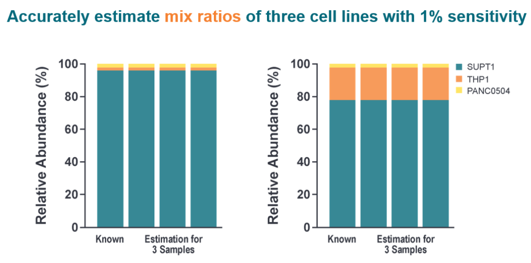 混合細胞:準確估算三種細胞系的混合比例,靈敏度為 1%。
