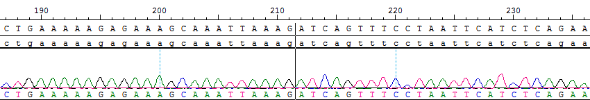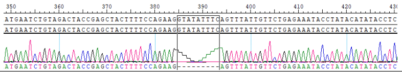 Fig 2. RNA的sanger測(cè)序發(fā)生14外顯子的缺失