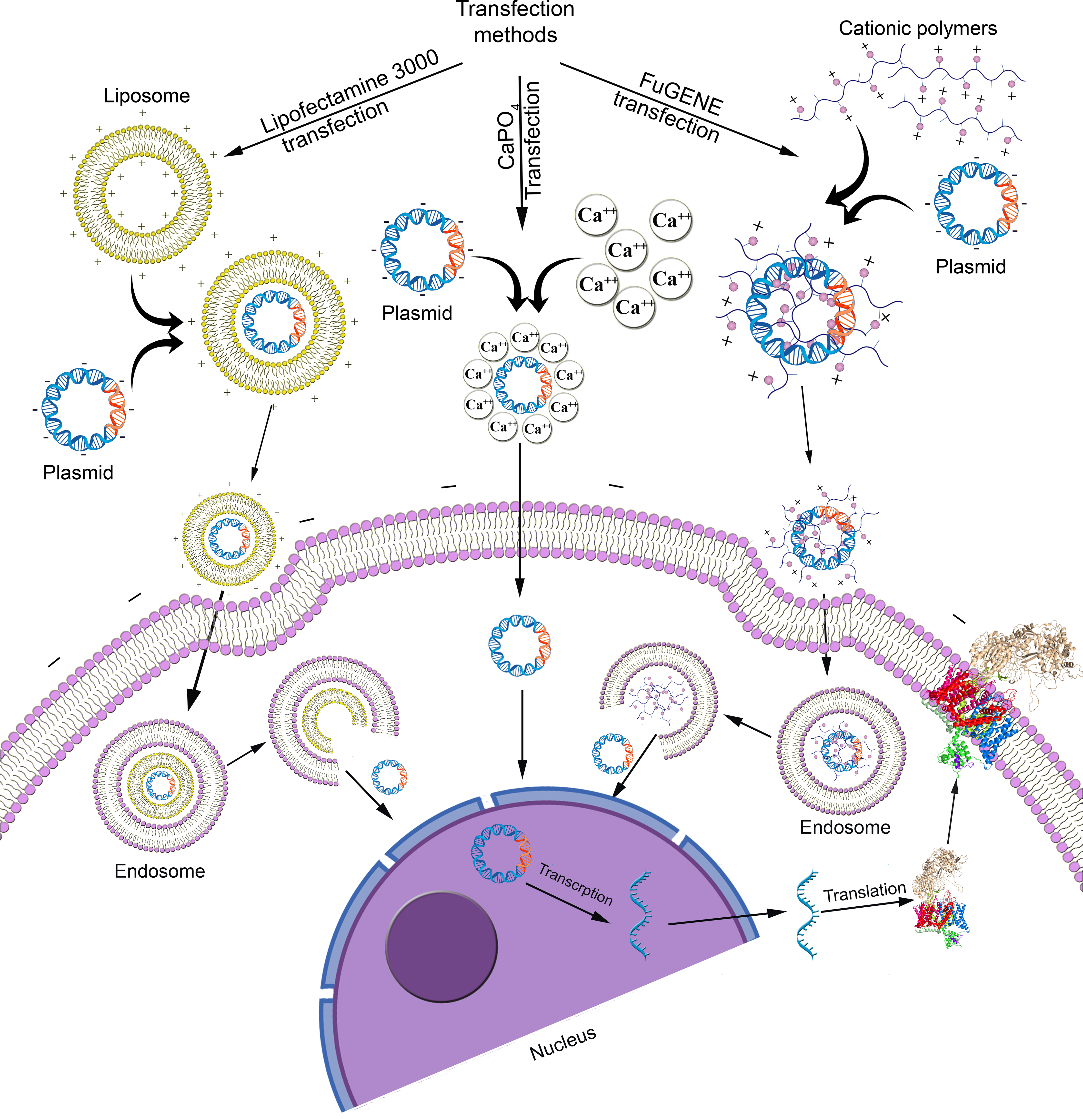 我們經(jīng)常使用的轉(zhuǎn)染化學(xué)試劑有Lipofectamine/CaPO4/FuGene/PEI等,原理基本是相同的: 1. 在體外混合質(zhì)粒和轉(zhuǎn)染試劑,質(zhì)粒DNA帶負電荷,轉(zhuǎn)染試劑帶正電荷,由轉(zhuǎn)染試劑包裹質(zhì)粒DNA在體外形成穩(wěn)定的復(fù)合物; 2. 外圍帶正電荷的復(fù)合物,接觸到帶負電荷的細胞膜,穿透細胞膜,形成Endosome(一種真核細胞內(nèi)的膜結(jié)合細胞器,屬于囊泡結(jié)構(gòu),是細胞內(nèi)吞作用中物質(zhì)運輸?shù)年P(guān)鍵環(huán)節(jié)); 3. 在細胞質(zhì)內(nèi)釋放外源的質(zhì)粒DNA,DNA通過核孔進入細胞核,參與外源基因的表達。