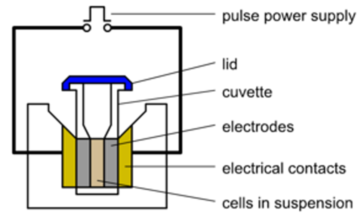 體外電穿孔時(shí),將靶細(xì)胞懸浮液與待導(dǎo)入細(xì)胞的質(zhì)粒DNA在導(dǎo)電溶液中混合,然后放入比色皿中(圖1)。電穿孔比色皿的樣品室兩側(cè)各有一塊金屬板,電流可以通過(guò)混合物。將比色皿放入電穿孔儀的腔室中,該腔室配有相應(yīng)的電觸點(diǎn),使比色皿形成電路。電穿孔儀上的控制器允許用戶設(shè)置待輸送電脈沖的電壓、波形和持續(xù)時(shí)間,這些參數(shù)應(yīng)根據(jù)靶細(xì)胞類型進(jìn)行優(yōu)化。然后,電脈沖通過(guò)樣品室。