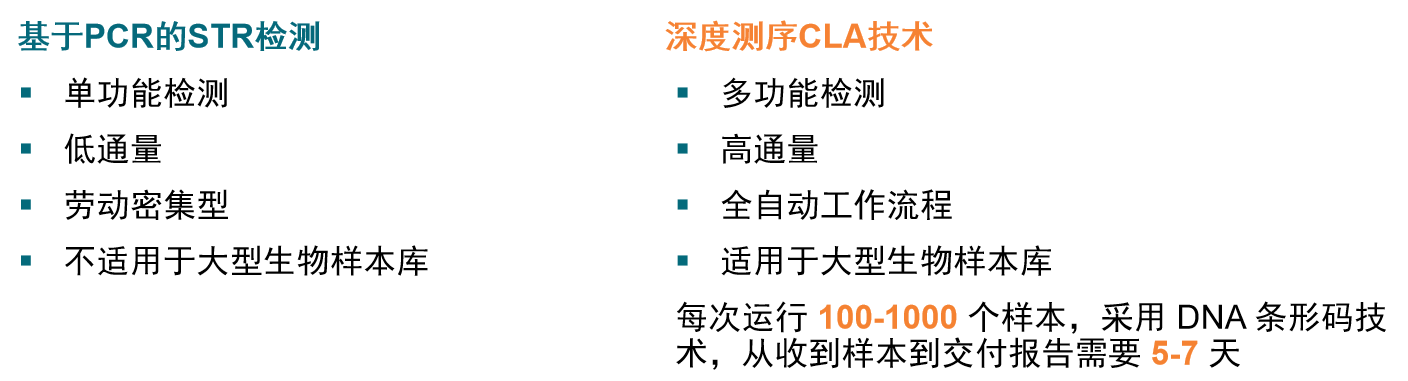 | 檢測(cè)項(xiàng)目 | 深度測(cè)序CLA細(xì)胞鑒定技術(shù) | 基于PCR的STR檢測(cè) |