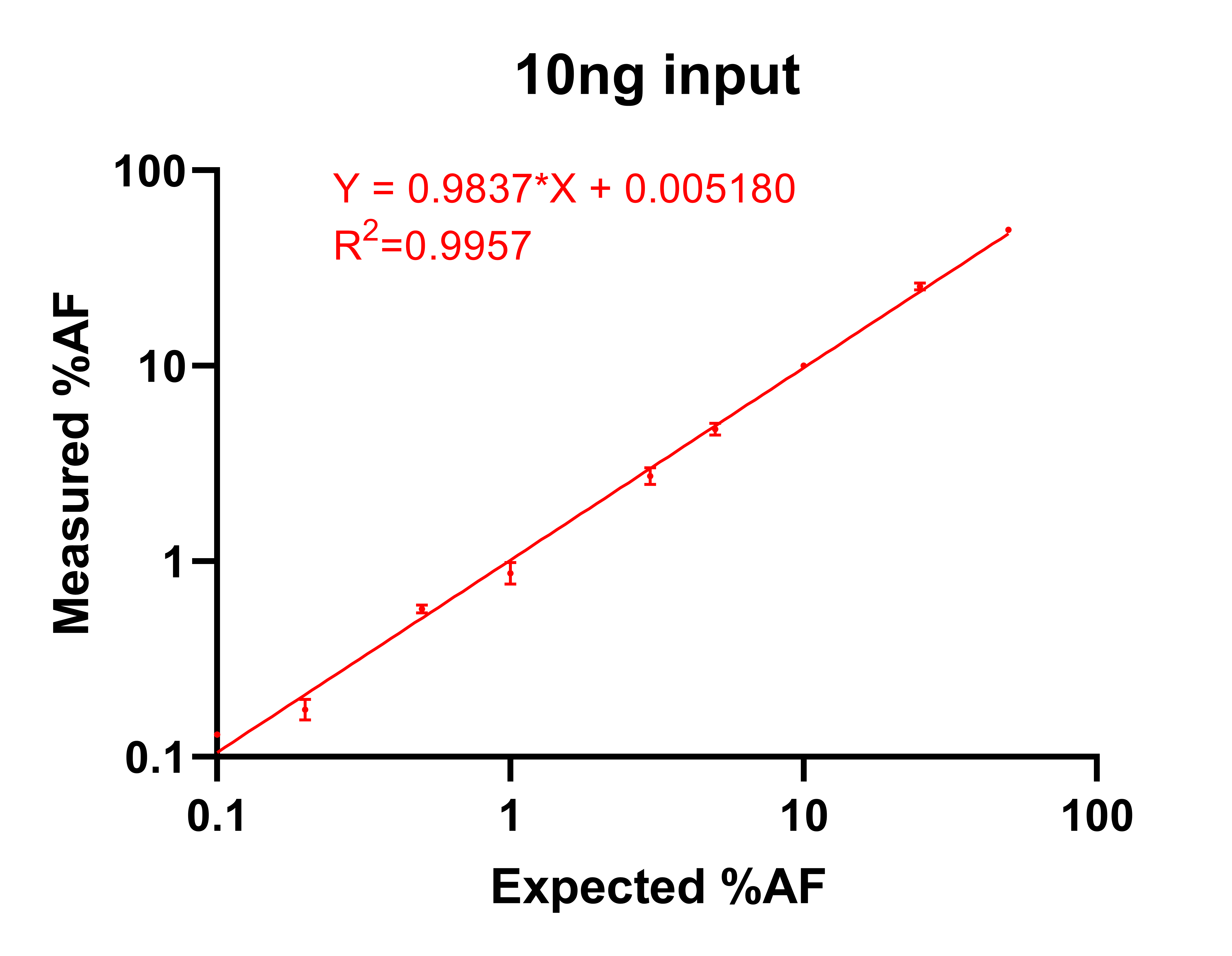 根據(jù)以上結(jié)論,我們選取10ng作為進(jìn)一步的%AF線性范圍探索,首先使用EGFR T790M的對應(yīng)的陰性標(biāo)準(zhǔn)品,對50%的標(biāo)準(zhǔn)品進(jìn)行有限稀釋,0.1%-50%間設(shè)置9個(gè)AF梯度,進(jìn)行數(shù)字PCR檢測(2復(fù)孔)。
