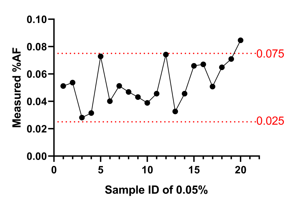 對20個(gè)0.05%的樣本進(jìn)行數(shù)字PCR檢測,觀察在0.025-0.075%以內(nèi)是否達(dá)成95%檢出。
