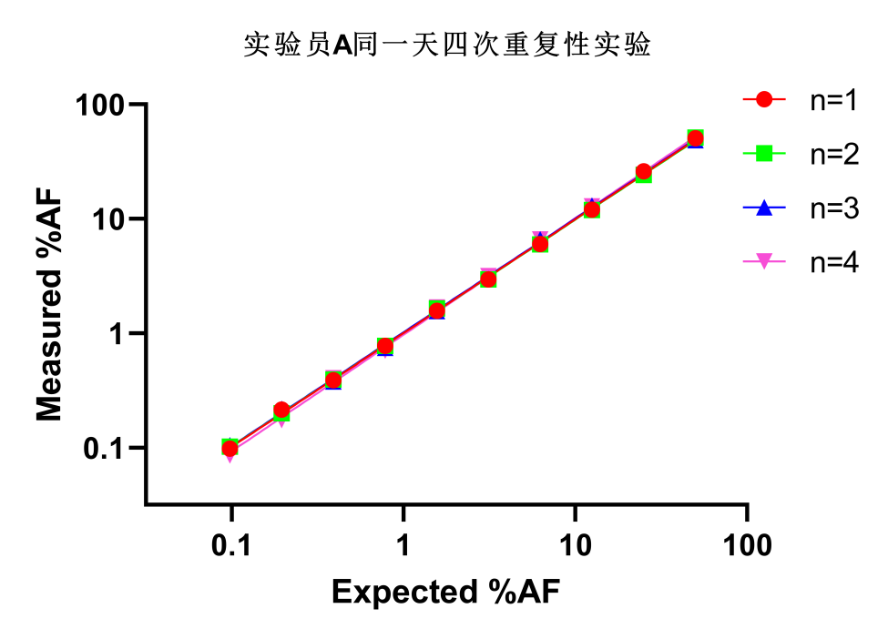 由上數(shù)據(jù)可見:EGFR T790M檢測體系是穩(wěn)定可重復(fù)的檢出的。