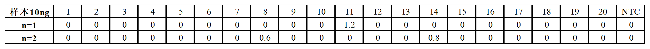 待測樣本:10個(gè)NGS驗(yàn)證為陽性的樣本(編號1-10); 10個(gè)NGS驗(yàn)證為陰性的樣本(編號11-20)。對20個(gè)樣本分別使用數(shù)字PCR檢測。