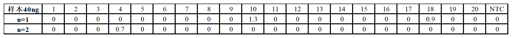 待測樣本:20個(gè)陰性樣本和1個(gè)NTC。分別將投入量設(shè)置為10ng和40ng,每個(gè)樣本做兩個(gè)重復(fù)進(jìn)行Bio-Rad數(shù)字PCR檢測。