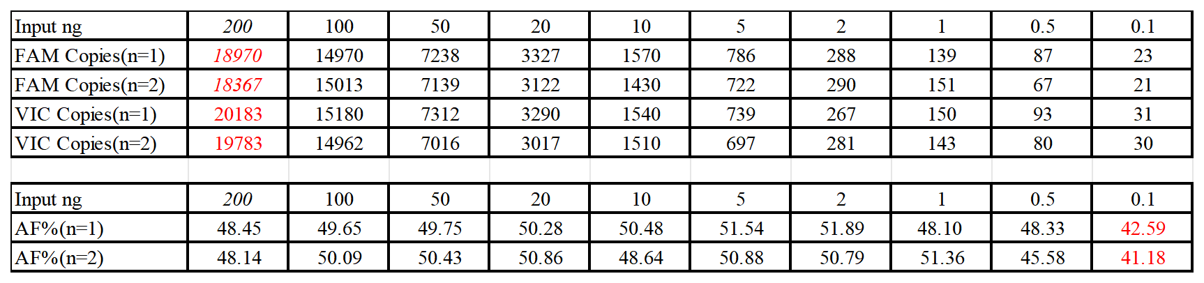 由上數(shù)據(jù)可見:無論是10ng還是40ng,LOB控制在2拷貝以內(nèi)(一般噪音拷貝為5以內(nèi)),雜點(diǎn)不呈現(xiàn)劑量的依賴,是隨機(jī)產(chǎn)生的噪音信號。