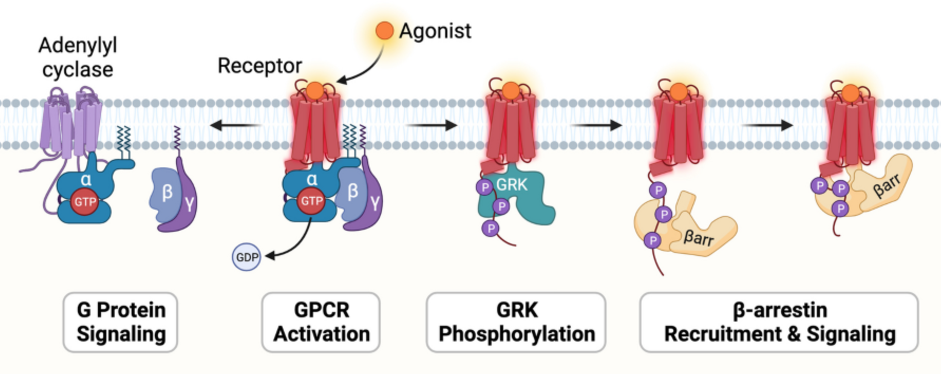G蛋白偶聯(lián)受體(GPCR)是真核生物中最大,種類最多的膜受體。目前,F(xiàn)DA 批準(zhǔn)上市的臨床藥物中,約三分之一的藥物作用于 GPCRs發(fā)揮治療作用,GPCRs 被認(rèn)為是新藥研發(fā)領(lǐng)域中最重要,也是最有應(yīng)用前景的藥物靶點(diǎn)之一。GPCR 可被多種配體激活,與配體結(jié)合后,GPCR 的構(gòu)象會(huì)發(fā)生變化,從而導(dǎo)致特定效應(yīng)蛋白的募集和激活,并觸發(fā)下游信號(hào)通路的調(diào)節(jié)。GPCR的下游信號(hào)主要由G蛋白和β-arrestin介導(dǎo)。兩種信號(hào)之間的平衡可以受到偏向性配體的調(diào)控。偏向性配體選擇性激活某些信號(hào),同時(shí)減少或阻止其它信號(hào),為開發(fā)副作用小的藥物提供了方向。