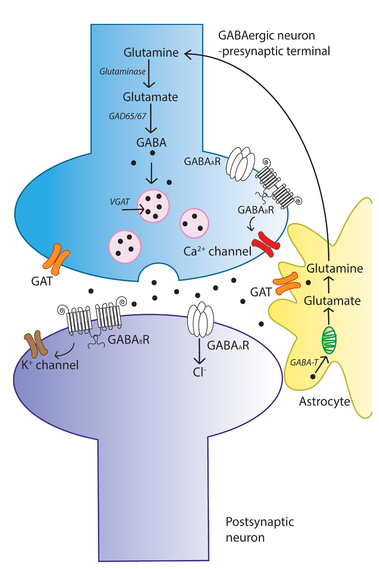 GABA的合成是通過谷氨酸酸脫羧酶(GAD)對(duì)L-谷氨酸的α-脫羧作用進(jìn)行的,并依賴于輔酶吡哆醛-5'-磷酸(維生素B6的一種維生素)。GAD存在兩種主要的亞型:65 kDa亞型(GAD65)和67 kDa亞型(GAD67)。GAD65是哺乳動(dòng)物大腦中表達(dá)的GAD的主要亞型,主要定位于突觸體的軸突末端,容易與質(zhì)膜相互作用,而GAD67則更廣泛地分布于細(xì)胞的細(xì)胞質(zhì)中。兩種GAD亞型的差異分布與細(xì)胞內(nèi)兩種GABA的存在相吻合,一種存在于囊泡中,另一種存在于細(xì)胞質(zhì)中,它們通過不同的機(jī)制釋放。GABA通過囊泡GABA轉(zhuǎn)運(yùn)蛋白(vGAT)的作用被募集到突觸囊泡中。在膜去極化后,GABA被釋放到突觸中,并可與突觸后膜上的嗜離子性GABA受體(GABAAR)或代謝性GABB受體(GABABR)結(jié)合,從而抑制突觸后神經(jīng)元。釋放的GABA通過膜結(jié)合的GABA轉(zhuǎn)運(yùn)體(GATs)從突觸中清除,在星形膠質(zhì)細(xì)胞中,GABA被循環(huán)進(jìn)入突觸囊泡或被線粒體吸收,在線粒體中被GABA轉(zhuǎn)氨酶(GABA- t)代謝為谷氨酰胺供神經(jīng)元攝取。