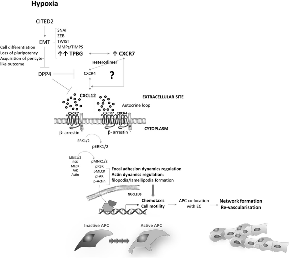CXCL12和CXCR4表達(dá)與許多腫瘤的發(fā)生有關(guān),有研究表明CXCR4的表達(dá)有助于癌細(xì)胞擴(kuò)散到CXCL12高表達(dá)的組織中,比如肺、肝、淋巴結(jié)和骨髓。在小鼠胚胎干細(xì)胞、成纖維細(xì)胞和癌細(xì)胞中,TPBG的上調(diào)與CXCL12的誘導(dǎo)有關(guān)。TPBG通過(guò)抑制負(fù)責(zé)CXCL12裂解的蛋白酶DPP4來(lái)延長(zhǎng)CXCL12的生物利用度。CXCL12通過(guò)結(jié)合CXCR4以及非典型CXCR7和CXCR4/CXCR7異源二聚體觸發(fā)細(xì)胞內(nèi)信號(hào)傳導(dǎo)。CXCR4和CXCR7也可以與β-arrestin-2形成復(fù)合物,從而促進(jìn)受體內(nèi)化并將信號(hào)重定向到其他不依賴(lài)G蛋白的途徑如p38 MAPK/ERK 信號(hào)通路。在某種程度上說(shuō)明5T4可通過(guò)CXCR4/CXCL12通路來(lái)影響腫瘤細(xì)胞的發(fā)生、發(fā)展、轉(zhuǎn)移等。
