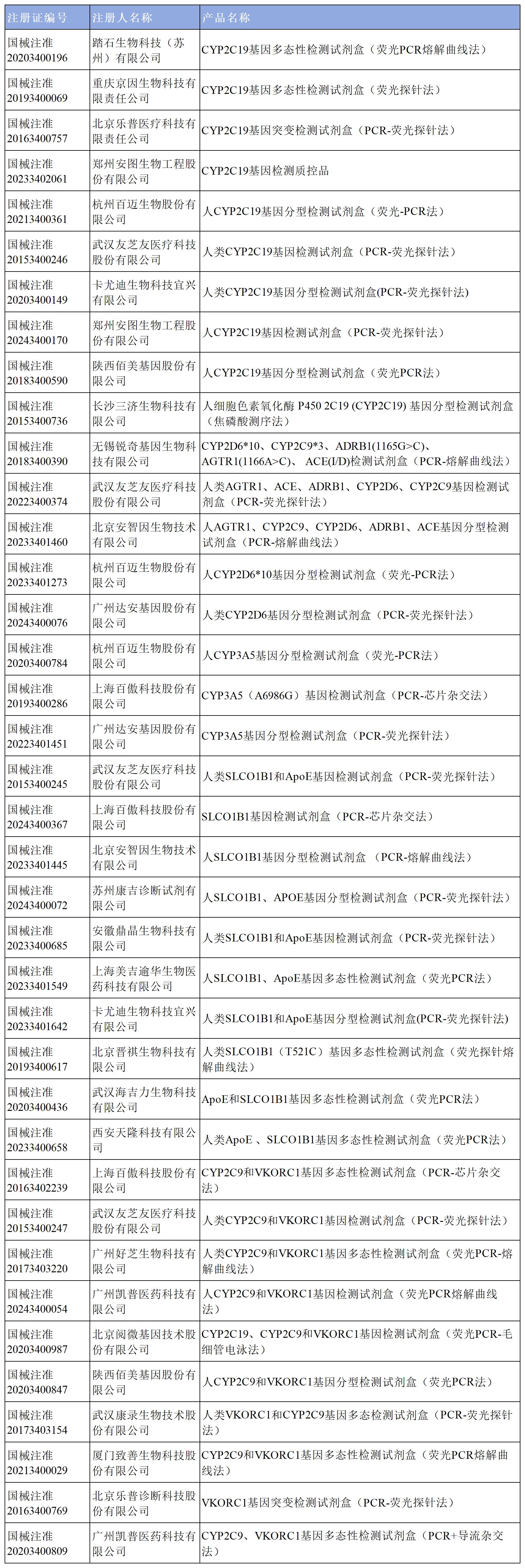 截至2023年9月,國內(nèi)批準(zhǔn)個性化用藥相關(guān)基因檢測產(chǎn)品包括CYP2C19、CYP2C9、UGT1A1、CYP2D6、ALDH2、CYP3A5、SLCO1B1、VKORC1、APOE、ACE、TOP2A、PML-RARα等標(biāo)志物。檢測常用的方法有實(shí)時熒光聚合酶鏈反應(yīng)(polymerase chain reaction,PCR)、PCR?電泳分析、PCR-基因芯片法、PCR-Sanger測序、熔解曲線法等分子生物學(xué)方法。