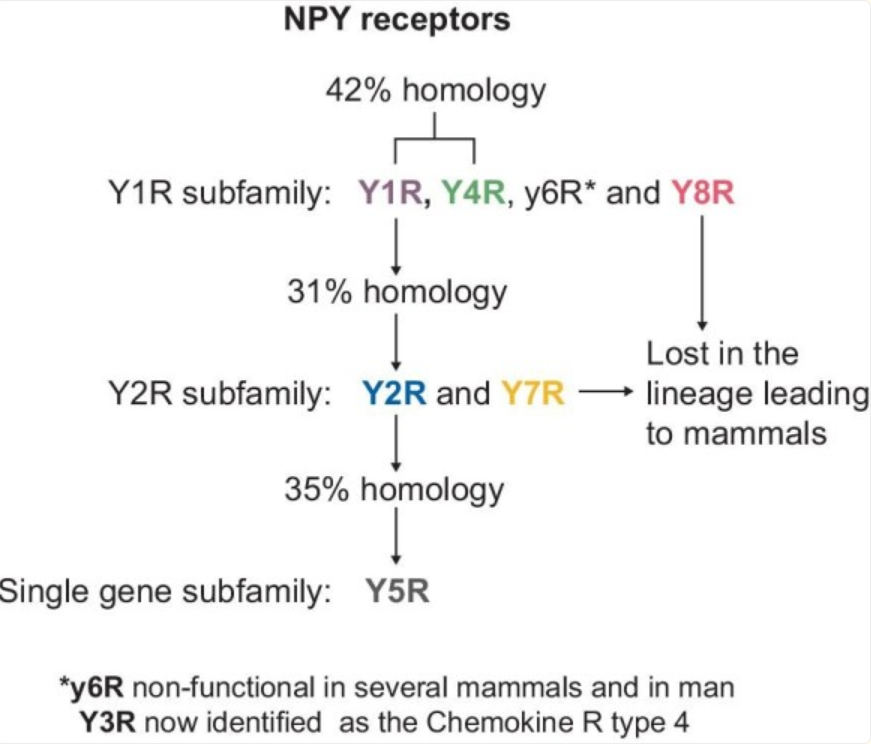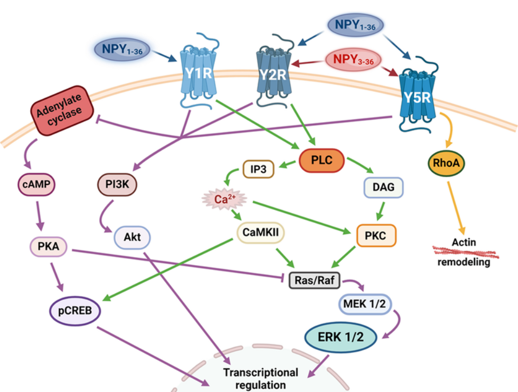 在人類(lèi)中,NPY主要通過(guò)三種GPCR- Y1R、Y2R和Y5R起作用。Y1R需要全長(zhǎng)NPY1-36才能激活,而Y2R和Y5R也可以結(jié)合NPY3-36。所有NPY受體通過(guò)Gi/o蛋白發(fā)出信號(hào),并通過(guò)腺苷酸環(huán)化酶抑制cAMP合成,從而阻斷PKA對(duì)下游通路的抑制作用。NPY信號(hào)傳導(dǎo)的第二種機(jī)制是針對(duì)Y1R和Y2R的,涉及Ca 2 +的動(dòng)員以及隨后PKC和CaMKII的鈣依賴(lài)性激活。同時(shí),這些信號(hào)通路導(dǎo)致ERK1/2的激活。此外,所有NPY受體都能夠激活PI3K/Akt通路。Y5R的具體特征是能夠激活RhoA,從而調(diào)節(jié)細(xì)胞骨架重塑。