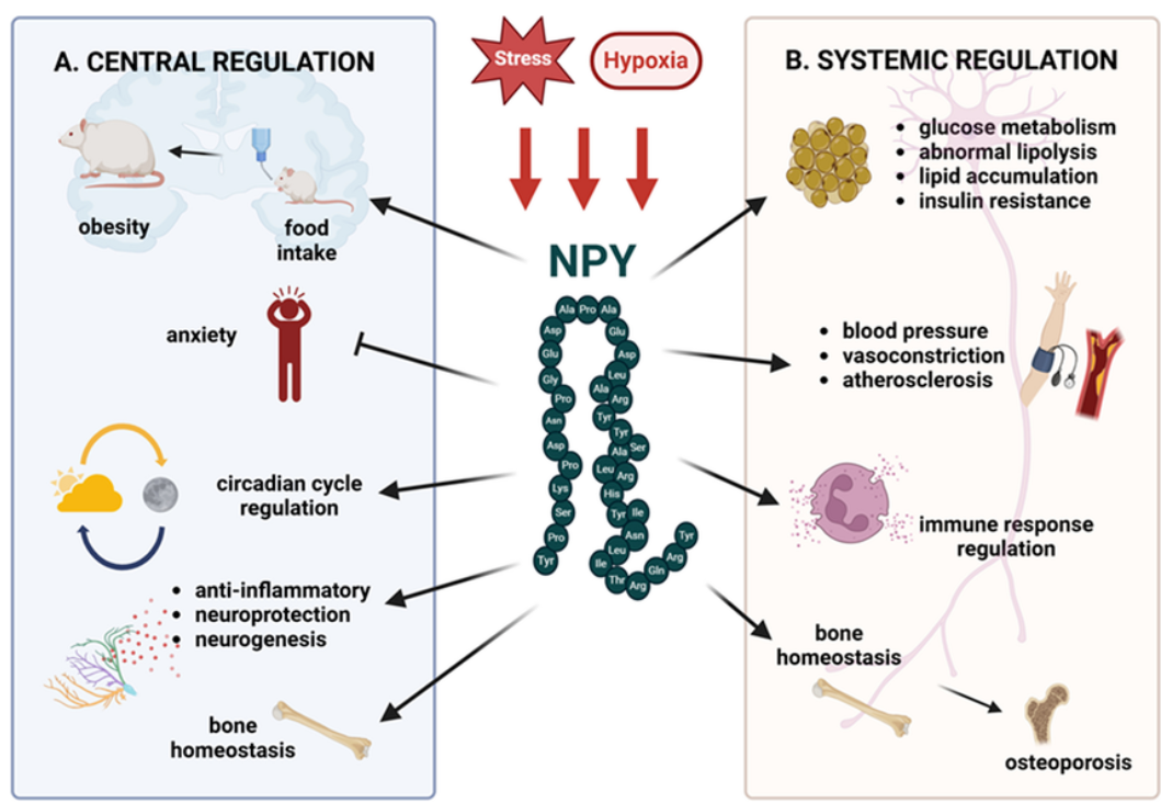 NPY受體被一個(gè)結(jié)構(gòu)相關(guān)的富含酪氨酸的多肽家族激活,即NPY(神經(jīng)肽Y),PYY(肽酪氨酸-酪氨酸)和PP(胰腺多肽),它們具有36個(gè)氨基酸的共同長(zhǎng)度和一個(gè)修飾的C段。NPY是中樞和周?chē)窠?jīng)系統(tǒng)中最豐富的肽之一,在能量穩(wěn)態(tài)中起著重要作用。NPY參與應(yīng)激反應(yīng)、食欲刺激、晝夜節(jié)律、免疫和骨骼穩(wěn)態(tài)等過(guò)程的中樞調(diào)節(jié)。在外周,NPY與去甲腎上腺素共同從交感神經(jīng)元釋放,影響代謝、心血管系統(tǒng)、骨骼健康和免疫反應(yīng)。盡管NPY的表達(dá)和釋放在很大程度上與交感神經(jīng)系統(tǒng)活性相關(guān),但現(xiàn)在已知幾種細(xì)胞對(duì)NPY有反應(yīng),NPY系統(tǒng)的失調(diào)與幾種病理狀況有關(guān),包括肥胖、心血管疾病、糖尿病和胰島素抵抗,這些狀況也經(jīng)常伴有蛋白尿和CKD。