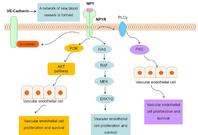 以血管內(nèi)皮細(xì)胞為例,NPY與其受體結(jié)合后,通過(guò)PI3K/AKT通路、RAS/RAF/MEK/ERK1/2通路、PKC通路促進(jìn)內(nèi)皮細(xì)胞增殖,為血管提供營(yíng)養(yǎng),調(diào)節(jié)微環(huán)境。