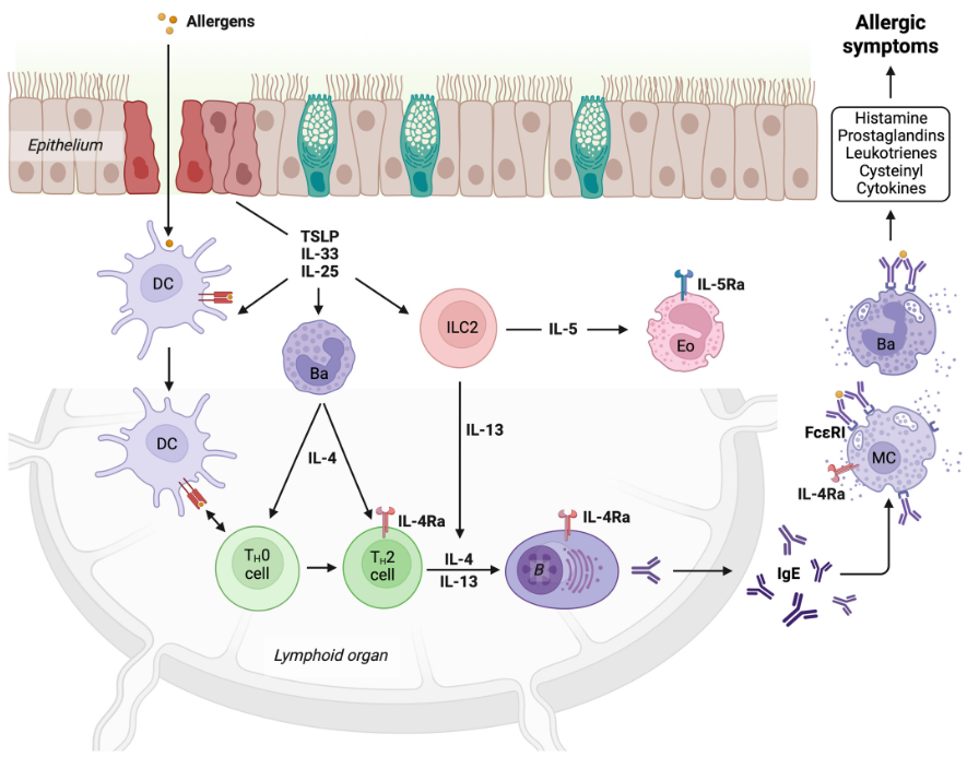 過(guò)敏的病因與Ⅱ型炎癥反應(yīng)密切相關(guān),會(huì)導(dǎo)致過(guò)敏原特異性免疫球蛋白E(IgE)的產(chǎn)生,這是許多過(guò)敏性疾病的關(guān)鍵驅(qū)動(dòng)因素。在高水平上,初始的過(guò)敏原暴露會(huì)破壞上皮的完整性,通過(guò)包括IL-25、IL-33和TSLP在內(nèi)的細(xì)胞因子觸發(fā)局部炎癥,這些炎癥激活Ⅱ型先天淋巴樣細(xì)胞以及其他免疫細(xì)胞來(lái)分泌Ⅱ型細(xì)胞因子IL-4、IL-5和IL-13,促進(jìn)Th2細(xì)胞的發(fā)育和嗜酸性粒細(xì)胞的招募。Th2細(xì)胞依賴的B細(xì)胞激活促進(jìn)了過(guò)敏原特異性IgE的產(chǎn)生,IgE穩(wěn)定地與嗜堿性細(xì)胞和肥大細(xì)胞表面的Fc段含高親和力受體(FcεRI)結(jié)合。在過(guò)敏原再次暴露后,這些細(xì)胞迅速脫粒導(dǎo)致過(guò)敏癥狀。