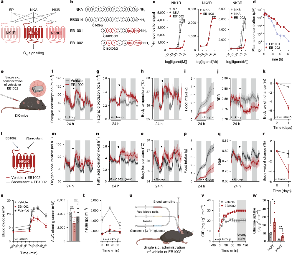 在文章研究部分,科研人員對肥胖模型小鼠注射了一種NK2R的天然配體激動(dòng)劑后發(fā)現(xiàn)這些肥胖小鼠體重在短期明顯下降,分析結(jié)果表明小鼠的能量消耗顯著增加,食物攝入下降約20%,且該代謝效應(yīng)并不依賴于瘦素(Leptin)信號通路。此外,科研人員發(fā)現(xiàn)優(yōu)化后的NK2R激動(dòng)劑EB1002不僅使小鼠在單次注射后的7天內(nèi)體重持續(xù)下降約15%,還能提高小鼠對胰島素的敏感性,促進(jìn)白色脂肪組織攝取葡萄糖,且能激活下丘腦弓狀核和室旁核神經(jīng)元來抑制因瘦素或黑皮質(zhì)素4受體缺失引起的高食欲狀態(tài)。這個(gè)結(jié)果表明該靶點(diǎn)可能在抗肥胖領(lǐng)域中,遠(yuǎn)比合并糖尿病的肥胖具有更廣泛的應(yīng)用前景。