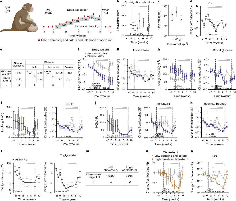 在患有心臟代謝疾病的肥胖的恒河猴中,NK2R激動(dòng)劑顯著降低了體重、血糖、甘油三酯和膽固醇水平,并改善了胰島素抵抗,這些結(jié)果表明NK2R激動(dòng)劑在非人靈長類動(dòng)物中也具有潛在的治療潛力。