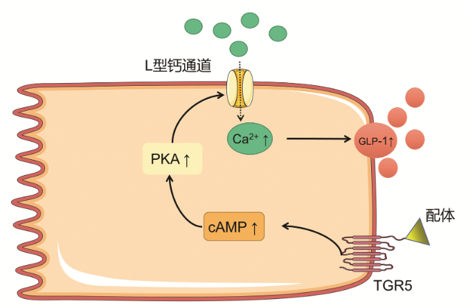 TGR5在維持葡萄糖穩(wěn)態(tài)和胰島素敏感性方面上的效果已得到廣泛證明。例如,使用TGR5激動(dòng)劑6α-乙基-23(S)-甲基-膽酸(6α-ethyl-23(S)-methyl-cholic acid,INT-777)可以提高肥胖小鼠的胰島素敏感性,7-硫酸膽酸以TGR5依賴性方式增加胰島素抵抗小鼠的葡萄糖耐量等。機(jī)體各組織的TGR5可通過不同的分子機(jī)制參與血糖代謝的調(diào)節(jié)。TGR5對(duì)于血糖代謝的作用,主要與腸促胰島素釋放相關(guān),通過刺激腸內(nèi)分泌L細(xì)胞分泌GLP-1來實(shí)現(xiàn)。既往研究發(fā)現(xiàn),GLP-1可促進(jìn)胰島素分泌,促進(jìn)胰島β細(xì)胞存活和增殖,抑制細(xì)胞凋亡,并且可有效刺激2型糖尿病患者的胰島素分泌并降低血糖。早期觀點(diǎn)認(rèn)為TGR5被激活后刺激腸內(nèi)分泌L細(xì)胞內(nèi)cAMP水平增加,線粒體氧化磷酸化增加,ATP/ADP比例增加,導(dǎo)致ATP依賴性鉀離子通道(KATP)關(guān)閉,開放鈣離子通道,促進(jìn)鈣離子內(nèi)流,釋放GLP-1。但后續(xù)大量研究驗(yàn)證了GLP-1的分泌確實(shí)與cAMP升高,胞內(nèi)鈣離子升高有關(guān),但與ATP依賴性鉀離子通道無關(guān)。Brighton等的實(shí)驗(yàn)進(jìn)一步驗(yàn)證了GLP-1分泌與L細(xì)胞內(nèi)的cAMP和Ca2+濃度變化有關(guān),并且說明了該作用主要由位于基底外側(cè)L細(xì)胞膜上的TGR5介導(dǎo)。近年來,Goldspink等發(fā)現(xiàn)腸L細(xì)胞上的TGR5被激活后,通過cAMP/PKA途徑,開放了L型Ca2+通道,促進(jìn)Ca2+內(nèi)流,引發(fā)GLP-1分泌。