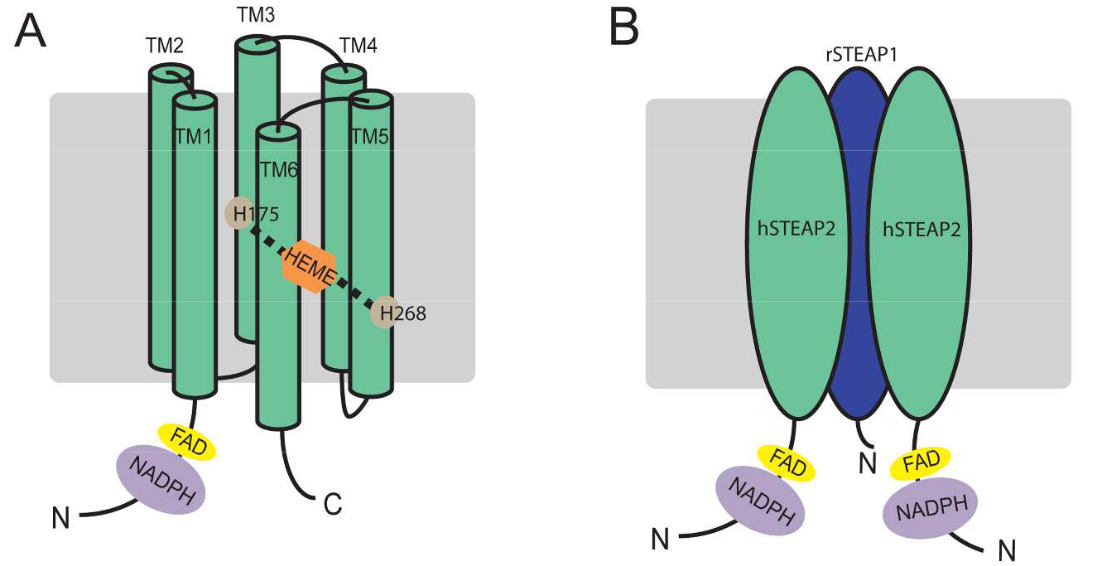 STEAP2,又被稱為前列腺六跨膜蛋白 1(STAMP1),是一種由 490 個(gè)氨基酸組成的(56.1 kDa)蛋白質(zhì),其在高爾基體復(fù)合體、跨高爾基體網(wǎng)絡(luò)以及質(zhì)膜中高度表達(dá)。這表明 STEAP2 參與了某些內(nèi)吞和外排運(yùn)輸途徑。STEAP2 有助于紅細(xì)胞中 Fe3+ 和 Cu2+ 的正常攝取,并將其還原為 Fe2+ 和 Cu+,從而促進(jìn)轉(zhuǎn)鐵蛋白循環(huán)的進(jìn)行。通過激活 ERK 通路,STEAP2 誘導(dǎo)癌細(xì)胞在 G0-G1 細(xì)胞周期階段的部分停滯,從而增加細(xì)胞增殖和腫瘤發(fā)展。