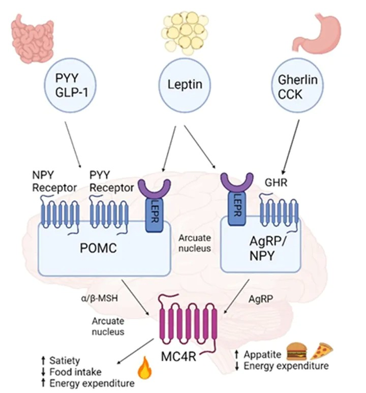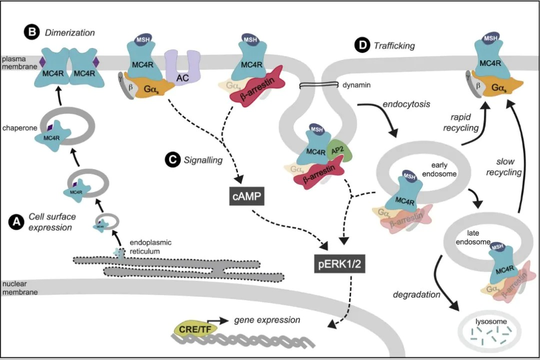 MC4R (黑皮質(zhì)素4受體) 是黑皮質(zhì)素受體家族成員之一,其家族屬于視紫紅質(zhì)樣A類GPCR,成員還包括:MC1R、MC2R、MC3R和MC5R。黑皮質(zhì)素受體 (MC1R-MC5R) 位于多種細胞類型上,并遍布大多數(shù)身體系統(tǒng)。MC4R是中樞黑皮質(zhì)素系統(tǒng)的重要組成部分,主要在下丘腦室旁核(PVH)中表達,是一種A類GPCR。在高能量平衡狀態(tài)下,阿片黑皮質(zhì)素原 (POMC) 神經(jīng)元釋放多肽MC4R激動劑-α-黑素細胞刺激激素(α-MSH)。α- MSH與MC4R結(jié)合會激活MC4R信號傳導(dǎo),抑制食欲和食物攝入。在低能量平衡狀態(tài)下,下丘腦室旁核中釋放AgRP (agouti-related peptide)。AgRP作為MC4R與α- MSH結(jié)合的競爭性拮抗劑,也是MC4R反向激動劑,抑制MC4R信號傳導(dǎo)。