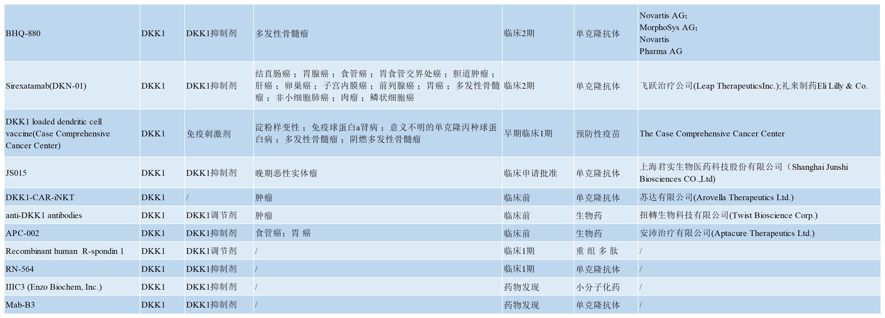 DKK1具有調(diào)節(jié)免疫的特性,它對(duì)免疫系統(tǒng)的抑制作用使其成為免疫治療的一個(gè)有前景的靶點(diǎn)。此前,Leap Therapeutics開(kāi)發(fā)了抗DKK1中和抗體DKN-01并在晚期胃食管交界處和胃癌癥(GEJ/GC)以及婦科癌癥的I期或II期試驗(yàn)中進(jìn)行了評(píng)估,其方案包括與紫杉醇或pembrolizumab的單藥治療和聯(lián)合治療比較,值得注意的是,患有Wnt信號(hào)突變的婦科癌癥患者可以從DKN-01治療中獲益。GEJ/GC的另一項(xiàng)正在進(jìn)行的臨床研究也表明,在腫瘤表達(dá)高水平DKK1(DKK1高)的患者中生存率和客觀反應(yīng)結(jié)果都有所提高;非常令人鼓舞的結(jié)果表明,DKN-01加Keytruda治療可使中位無(wú)進(jìn)展生存期(PFS)超過(guò)22周,中位總生存期(OS)接近32周,在既往未接受抗PD-1/PD-L1治療的DKK1高GEJ/GC患者中,ORR為50%,疾病控制率(DCR)為80%;在對(duì)PD-1/PD-L1治療難治的6名GEJ/GC患者中,3名血清DKK1水平高的患者病情穩(wěn)定,而3名血清DKK1水平低的患者病情則發(fā)生進(jìn)展。這些結(jié)果表明,DKK1抑制治療顯著改善了血清DKK1水平高的患者的療效,并由此得出在DKK1高表達(dá)腫瘤患者中使用DKK1抑制劑和PD1/PDL-1免疫檢查點(diǎn)聯(lián)合治療的方案是一種獲得更好療效的策略。目前已有多個(gè)DKK1抑制劑處于研發(fā)階段,其中多數(shù)為DKK1的中和抗體,也有少量的小分子及重組多肽,小核酸藥物等( 如下表所示)。