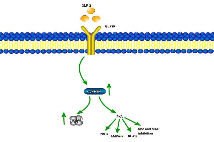 胰高血糖素樣肽2受體(glucagon like peptide 2 receptor, GLP2R)屬于G蛋白偶練受體超家族,是胰高血糖素受體家族的成員,同GLP-1、胰高血糖素和GIP的受體有較高的同源性。人GLP2R基因定位于染色體17p13.3,編碼553個氨基酸。GLP2R主要表達(dá)于胃腸道中,GLP-2是一種有效的腸道生長因子,結(jié)合GLP-2R后,激活腺苷酸環(huán)化酶,呈劑量依賴性的產(chǎn)生大量cAMP,激活PKA,從而使cAMP反應(yīng)元件(CRE)和AP-1 依賴的轉(zhuǎn)錄增加,使被調(diào)控基因的表達(dá)發(fā)生變化。